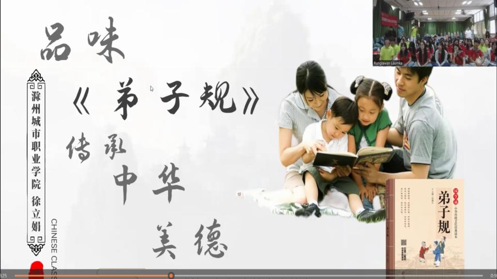 为弘扬中华优秀传统文化,促进中泰两国文化交流,6月26日上午,教育学院院长徐立娟应邀为泰国玛哈沙拉堪皇家大学师生开展“品味《弟子规》,传承中华美德—《弟子规》中的家庭教育”的主题讲座。