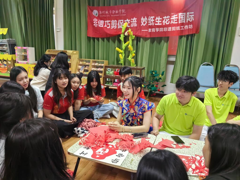 6月24日,滁州城市职业学院教育学院的10名学前教育专业交换生在泰国玛哈莎拉堪皇家大学成功举办了主题为“非遗巧剪促交流,妙纸生花走国际”的非遗剪纸小课堂。