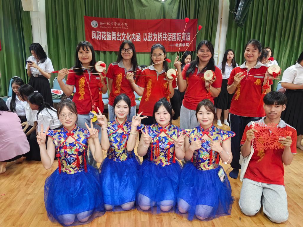 6月26日, 在泰国玛哈莎拉堪皇家大学,滁州城市职业学院教育学院的学子们以一场充满活力的凤阳花鼓宣传体验活动,再次将中国非物质文化遗产的魅力带向国际舞台。本次活动以“凤阳花鼓舞出文化内涵,以鼓为桥共话国际友谊”为主题,旨在通过凤阳花鼓的展示与教学,促进中泰两国文化的交流互鉴。