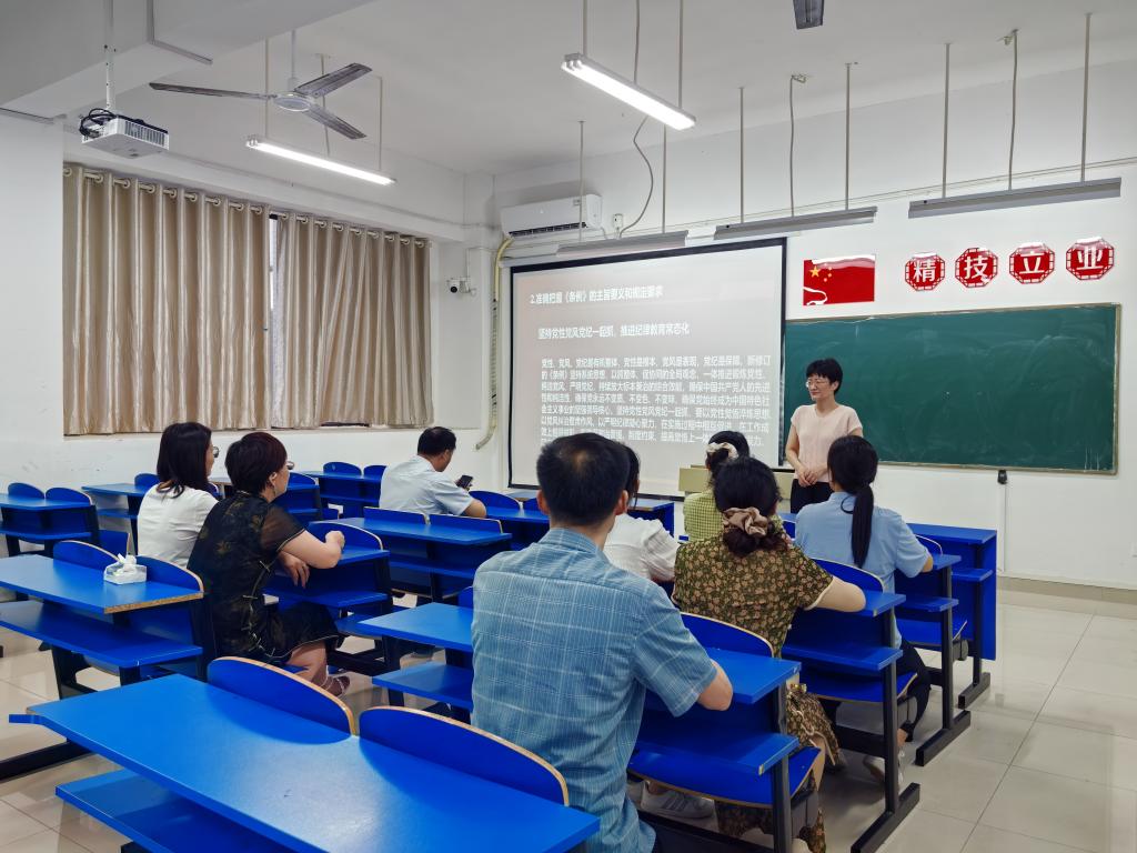 为深入学习贯彻《中国共产党纪律处分条例》,推进党纪学习教育走深走实,进一步增强全体党员的思想自觉、政治自觉和行动自觉,教育学院教工第二党支部书记邵云于6月19日下午在C1南308为支部党员讲授“坚持严的主基调不动摇 高质量开展党纪学习教育”专题党课。