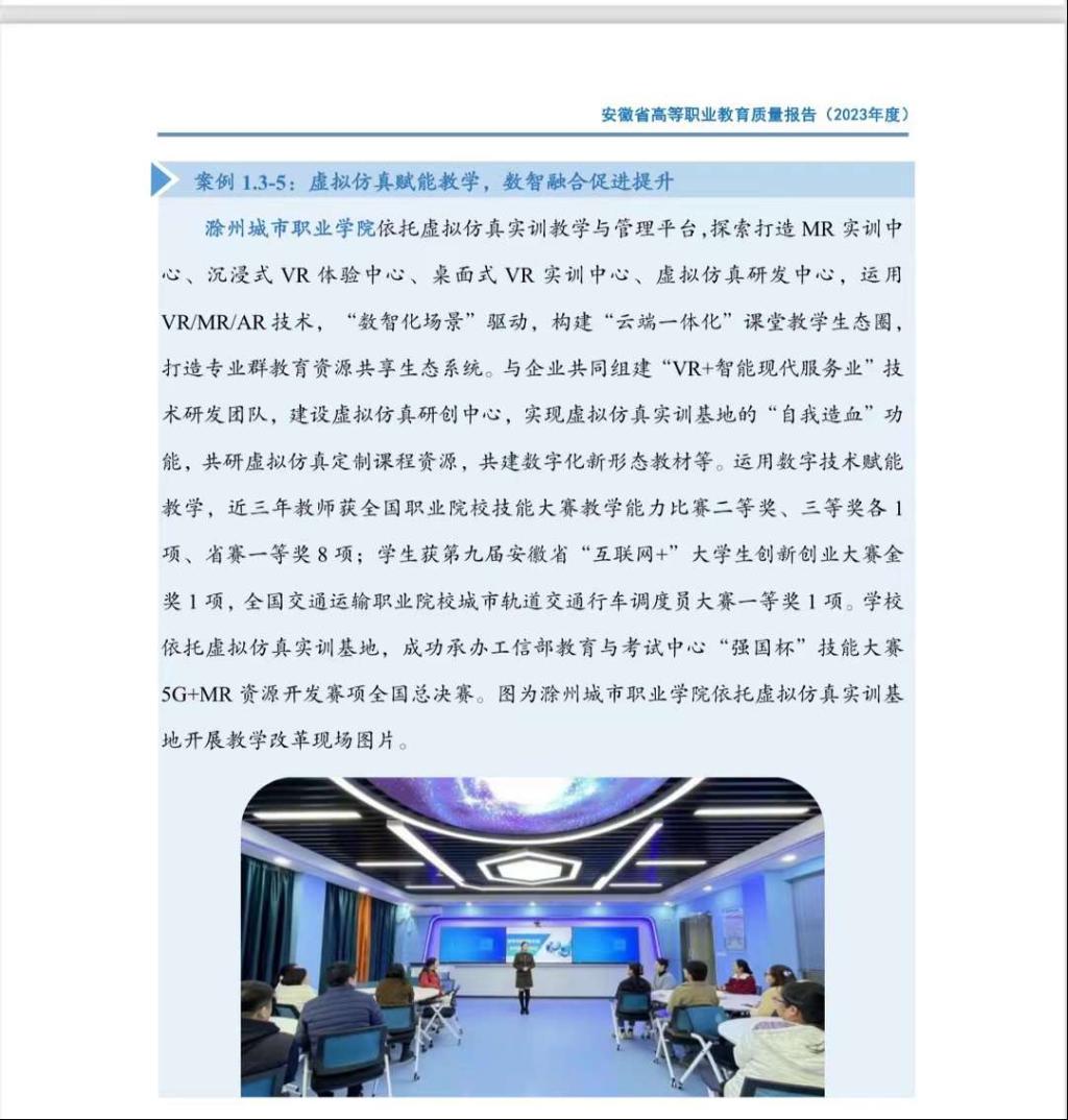 近日,在安徽省教育厅网站上公布的《安徽省高等职业教育质量报告(2023年度)》中,我院学前教育MR虚拟仿真实训中心案例成功入选!祝贺!