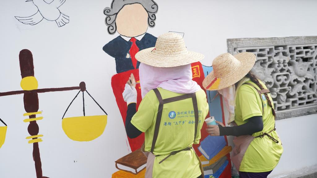 活动中,师生们齐心协力,不惧炎热,在高温下连续工作一周,用手中的画笔在宣城旌德县云乐镇法治广场留下了一幅幅精美的法治宣传墙绘。这些墙绘内容丰富多样,涵盖了宪法知识、法治案例、法律援助等多个方面。通过生动形象的画面和简洁明了的文字,将严肃的法治主题以通俗易懂、引人入胜的方式呈现出来。最终完成了5幅墙面、近300平的墙绘制作,描绘出了一幅完整的法治“长卷”,得到了当地政府和村民的高度认可。