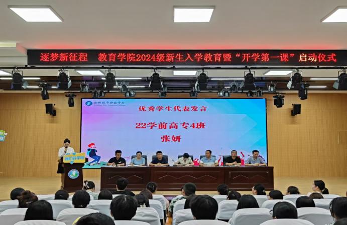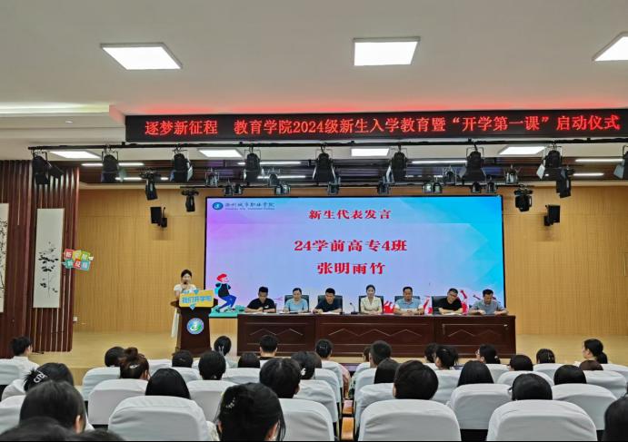 22学前高专4班张妍作为老生代表发言,分享了自己在教育学院成长及收获,鼓励新同学们要勤勉学习、博学笃思,并且要立足专业,勇于承担社会责任,并以自己经历为例,激励新生们珍惜大学时光,勇敢追求梦想,不断超越自我,成为更好的自己。24学前高专4班张明雨竹作为新生代表发言,表达相遇滁城院的美好和对师范专业学习的期待以及在未来践行着教育的理想与情怀。