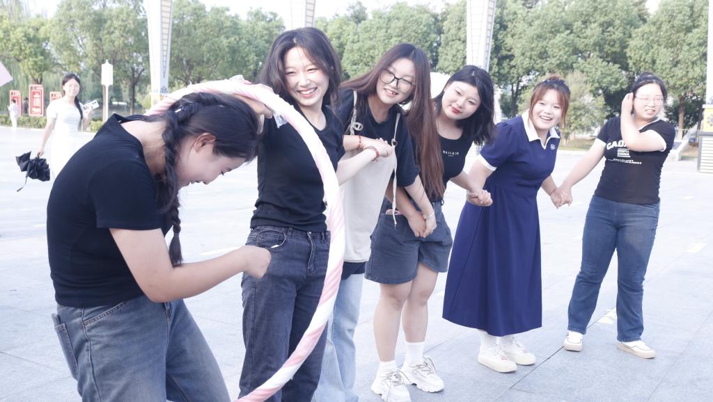 传递团圆游戏则寓意深刻,象征着中秋佳节的“团圆”主题。参与者分为两组,手拉手围成一个圆圈,大家需要在不使用双手的情况下,将套在手臂上的呼啦圈依次传递至每个人的身体。虽然动作看似简单,但在配合默契的过程中,体现了团队合作的精神和团圆的象征意义。随着游戏的推进,大家的笑声、加油声此起彼伏,欢快的气氛弥漫全场。