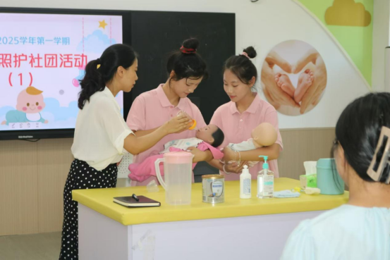 接下来,社团成员们复习了喂奶技巧。活动中,老师详细讲解了婴儿喂奶的正确姿势、奶瓶的消毒方法以及不同年龄段婴儿的喂奶注意事项。大家不仅认真学习,还通过模拟婴儿模型进行了实际操作练习,确保每位成员都掌握了科学的喂奶方法。这一环节提高了大家在照护婴幼儿时的信心,确保他们能够提供健康、安全的饮食照护。