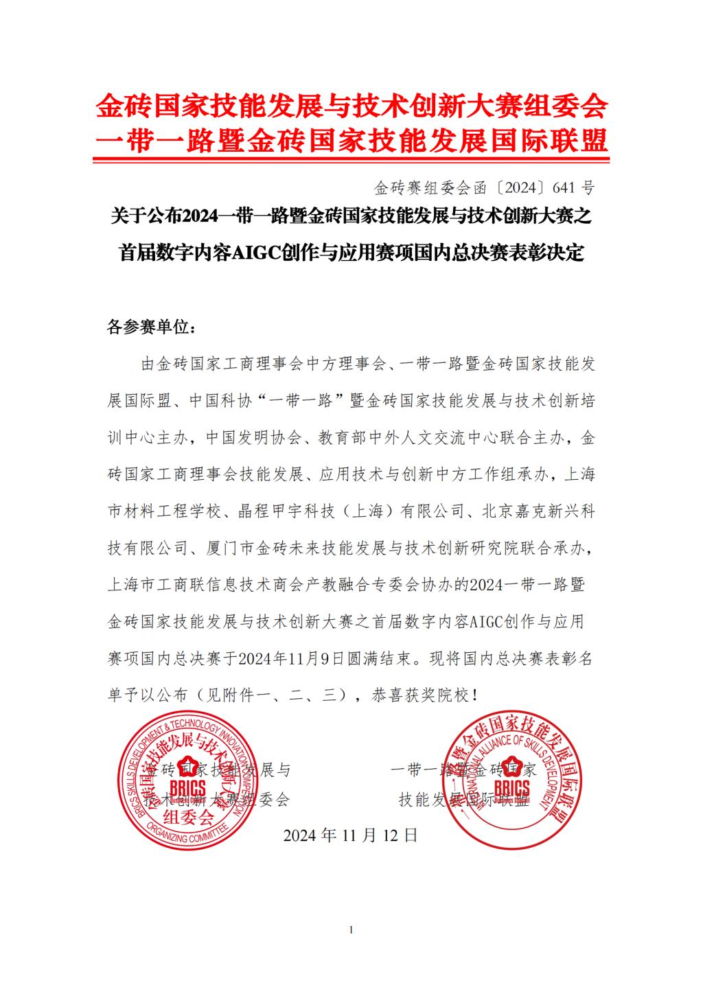 喜报!我院获2024一带一路暨金砖国家技能发展与技术创新大赛AIGC创作与应用赛项高职组一等奖
