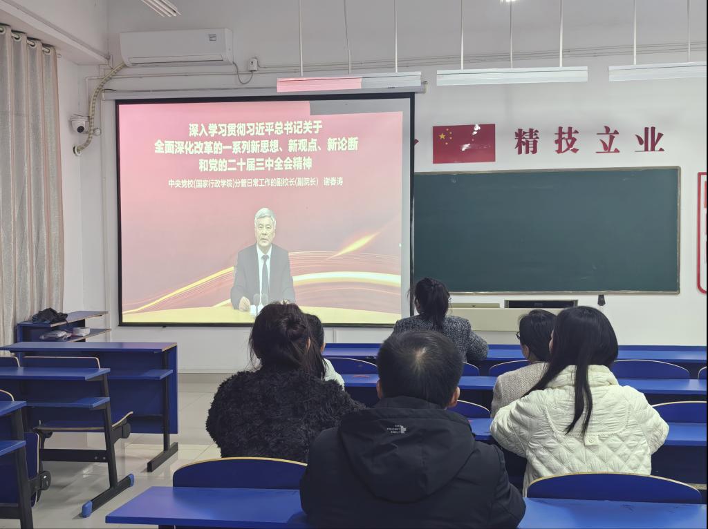 为深入学习贯彻党的二十届三中全会精神,引导支部全体党员深刻领会和进一步把握全会精神,教育学院教工第二党支部于11月28日下午在恩镇楼104组织全体党员集中观看了中央党校(国家行政学院)分管日常工作的副校长(副院长)谢春涛同志主讲的“深入学习贯彻习近平总书记关于全面深化改革的一系列新思想、新观点、新论断和党的二十届三中全会精神”视频课程并进行研讨交流,会议由支部纪检委员邵晓主持。