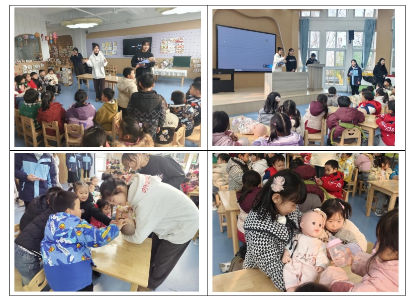 社团成员抵达幼儿园后,首先开展的是角色体验活动——我来当爸妈。社团成员使用智能仿真婴儿向园所中班、大班幼儿进行了示范演示,教幼儿识别智能婴儿的不同哭声,分辨婴儿的不同需求,随后成员们手把手的去教幼儿如何抱放婴儿,如何给婴儿喂奶,幼儿们也积极尝试使用奶瓶给仿真婴儿喂奶,哼唱儿歌给智能婴儿哄睡。系列活动满足了幼儿角色扮演的需求,充分锻炼了幼儿的动手能力,获得了强烈的角色体验感。