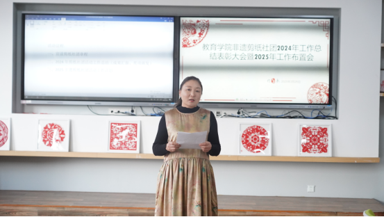 随后,黄红艳老师全面梳理2024年社团工作。过去一年,社团活动丰富多元,积极投身各类活动。在校园文化节中,社团以精湛的剪纸技艺打造出独特文化景观,吸引众多师生沉浸于剪纸艺术的奇妙世界;在社区文化交流活动里,成员们与社区居民亲切互动,让剪纸艺术走进大众生活;在各类作品展示活动中,社团作品凭借精巧构思与细腻技法脱颖而出,大放光彩。这些活动极大地丰富了校园文化生活,也显著提升了社团的影响力。在教学成果上,社团教学成效斐然,成员们的剪纸技艺进步明显,充分展现了社团教学的卓越质量