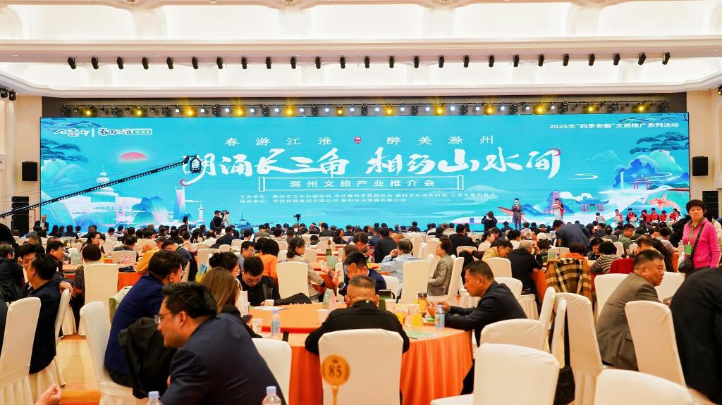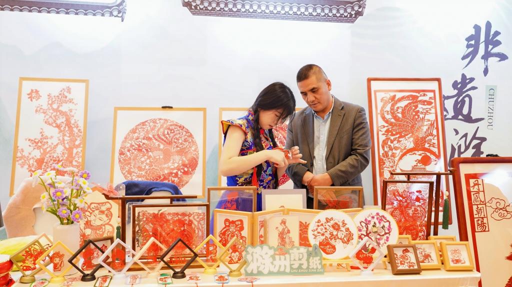 推介会现场设置了滁州文旅展区,从“诗画滁州”“田园滁州”“山水滁州”“品味滁州”“非遗滁州”五大板块,“非遗滁州”包括凤阳花鼓、凤画、滁州剪纸、滁菊等非遗产品,展示滁州的文旅魅力。