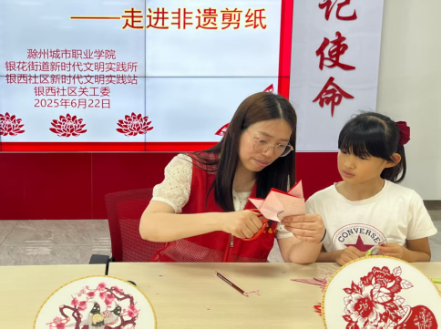 为传承非遗文化,丰富辖区未成年人课余生活,6 月 22 日,我院走进南谯区银花街道银西社区,举办了一场别开生面的“巧剪红笺 纸间新韵” 非遗剪纸进社区主题活动,为辖区未成年人的课余生活增添了一抹绚丽的文化色彩。