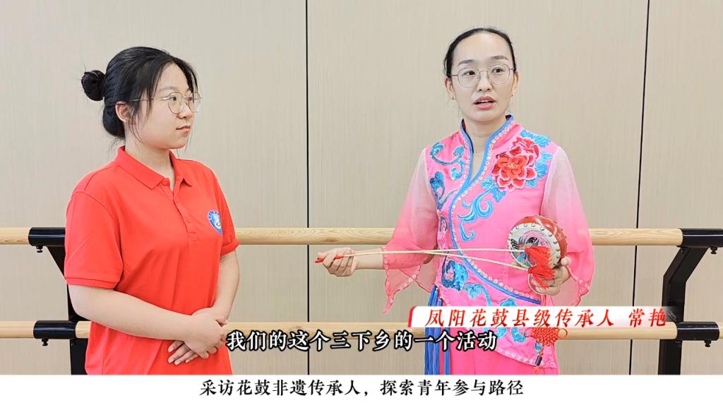 行动队成员们与凤阳花鼓县级传承人常艳老师同台献艺,演绎了传统与现代交融的花鼓舞片段,赢得满堂喝彩。在采访常艳老师的过程中,团队成员深入了解到花鼓艺术在当代传承中的挑战与创新尝试,并现场录制高质量教学素材,为后续打造“云端花鼓学院”数字化传播平台积累了宝贵资源。
