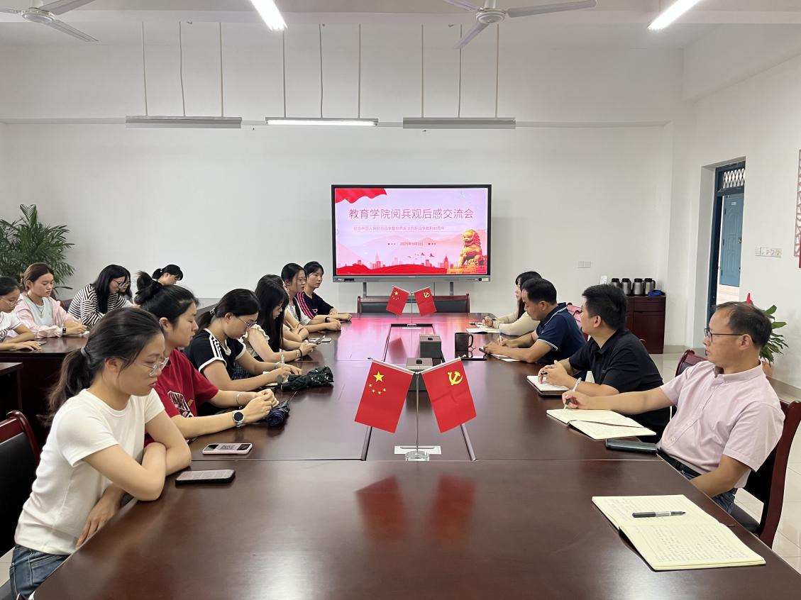 开展观后感交流会。下午,教育学院党总支组织阅兵观后感交流会,会议由党总支书记刘亮主持,各班班长、团支书、思政委员等共23名学生代表参加,交流会上,学生代表们踊跃发言,激情讲述阅兵式上的震撼画面,表达对祖国强大的自豪之情,刘亮从感慨、感动、感恩、感悟四个角度分享了自己的心得体会,激励大家要珍惜现在、付诸行动,将爱国之情转化为报国之志。各党支部结合主题党日活动开展学习交流,党员同志们畅谈感受,纷纷表示要铭记历史,缅怀先烈,传承和弘扬伟大的抗战精神,将对祖国的热爱转化为学习和工作的动力,为实现中华民族伟大复兴的中国梦贡献自己的力量。