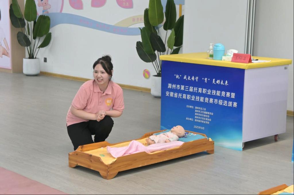 9月7日,由滁州市总工会、滁州市卫生健康委员会、滁州市妇女联合会、滁州市计划生育协会联合主办,滁州城市职业学院承办的滁州市第三届托育职业技能竞赛暨全省托育职业技能竞赛市级选拔赛顺利举行。本次竞赛以“‘托’成长希望,‘育’美好未来”为主题,旨在以赛促学、以赛提能,切实提升托育机构服务能力与从业人员专业水平,为婴幼儿健康成长筑牢保障防线。