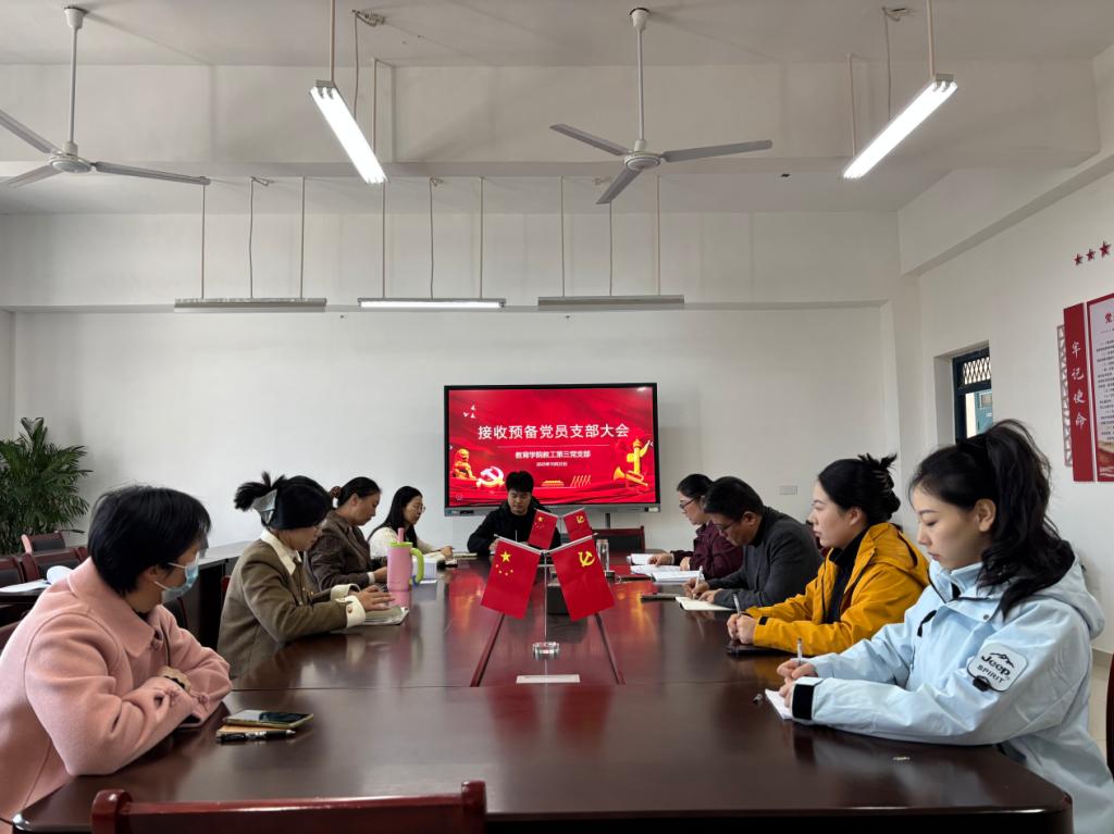 为加强党组织建设,充实党员队伍,10月22日,教育学院教工第三党支部在恩镇楼2202党员活动室召开接收预备党员大会。支部共有9位党员参加,会议由党支部书记徐校会主持。