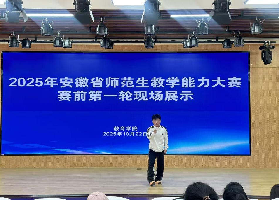 教育学院为备赛2025年安徽省师范生教学能力大赛,于10月22日下午在教育学院报告厅举办了第一次赛前汇报展示。进入决赛的五组选手齐聚一堂,进行了全面的赛前演练,三系主任及各赛项指导老师到场观摩并给予指导。