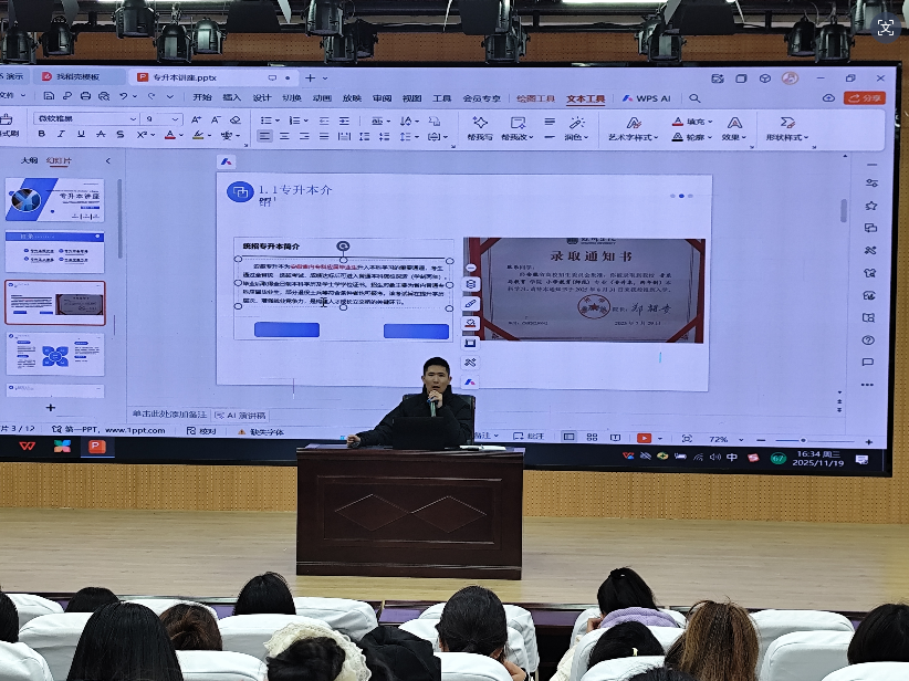 为进一步激发我院学子专升本备考热情,明确学习方向,营造积极向上的学习氛围,教育学院于11月18日下午在教育学院报告厅举办专升本辅导讲座,本次讲座由耿乐同学进行经验分享与交流,各班学习委员及百余名学生代表参与。