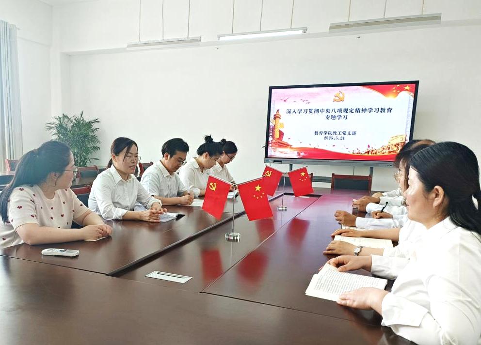为推动深入贯彻中央八项规定精神学习教育进一步走深走实,5月21日下午,教育学院教工党支部在恩镇楼2202党员办公室组织开展深入贯彻中央八项规定精神学习教育。支部书记王李艳主持会议,支部全体党员参加。