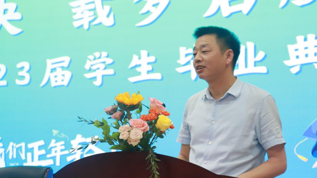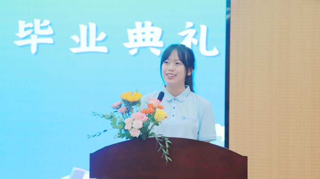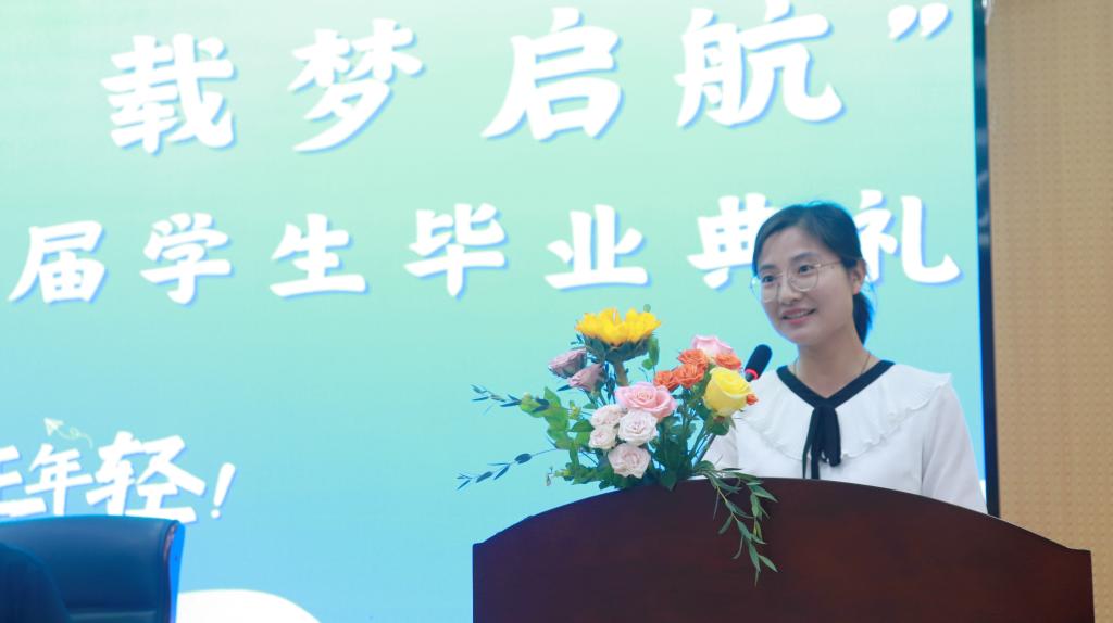 张晶晶作为教师代表发言,她对顺利完成学业毕业的同学们表达了祝贺,期望毕业生们能承载起母校寄予的厚望,担负起历史的使命,踏上新的征程,在广阔的天地中施展丰富学识、聪明才智和远大抱负,用学识和才智回报社会。