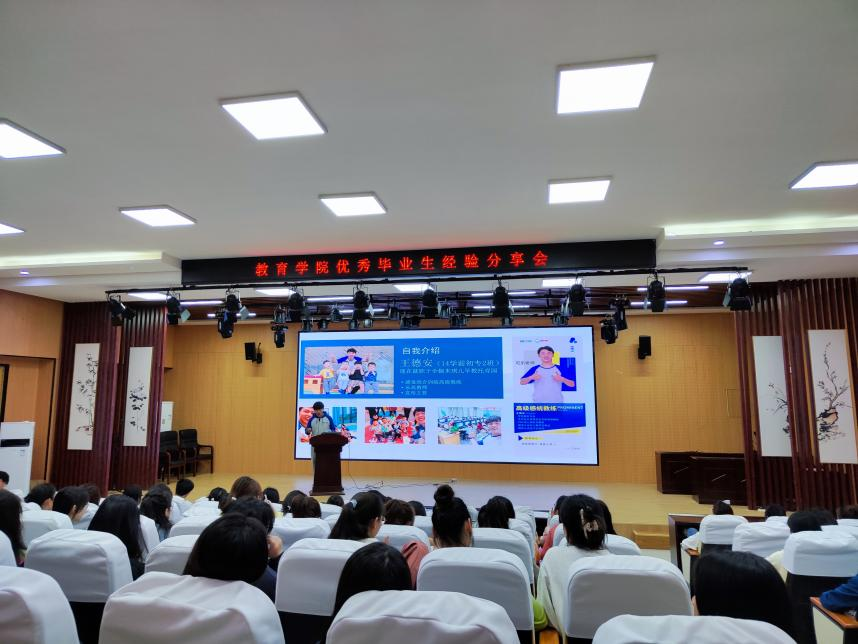 王德安,中共党员,2014级学前教育专业,在校期间曾任职教育学院学生会主席,曾创业谦达印象文化传媒公司,现就职于全椒米琪儿早教托育园,任职宣传主管。王学长首先分享了自己大学丰富的生活,从做音乐,创业当老板,当导演三个方面鼓励年轻人要有梦想,要为梦想付出脚踏实地行动。同时他也给我们的学生提出了几点建议:一是在校期间练好基本功,二是把该考的证都考到手,三是怀揣一份谦虚的态度,四是保持稳定的心态和钻研的精神。王学长的分享既精彩纷呈又诙谐幽默,多次被同学们热情的掌声打断。