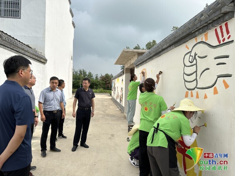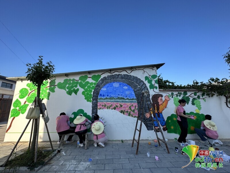 图为实践队员在为墙绘上色。中国青年网通讯员 黄正顺 摄
