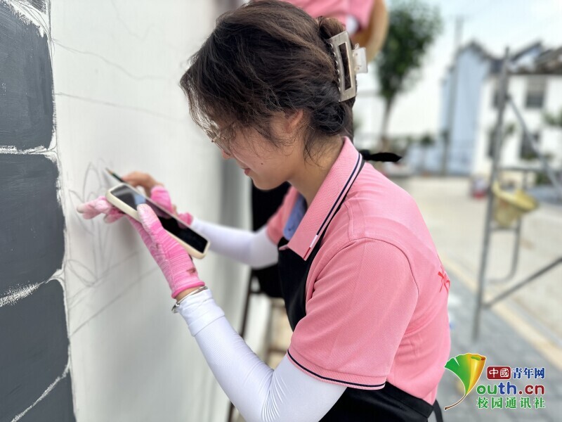 图为实践队员在为墙绘描边。中国青年网通讯员 黄正顺 摄