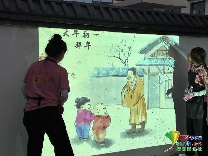 图为实践队员利用投影在为墙绘打底。中国青年网通讯员 黄正顺 摄