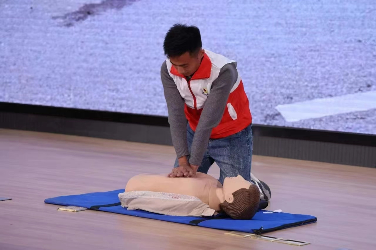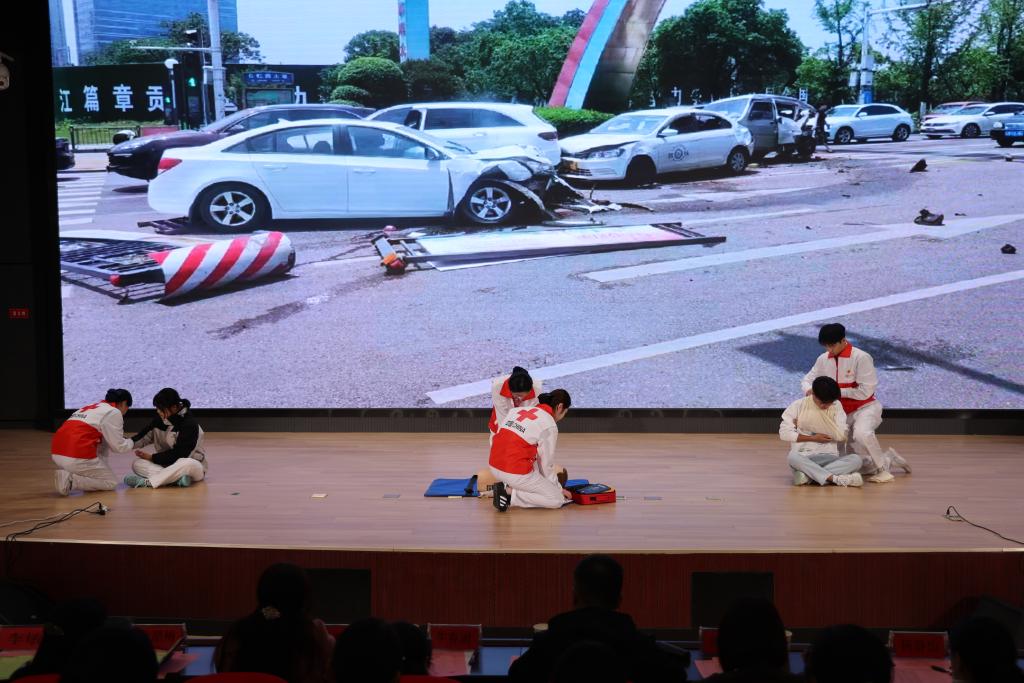 比赛分情景模拟演练和评委提问两个环节,考验选手临场评估伤情、观察情况与救护操作的能力。7分钟倒计时开始,每队4名队员同时操作场景题中的不同急救项目内容,现场气氛紧张又激烈,我院选手们有条不紊,以严谨的态度、娴熟的操作技能应对比赛,体现了抢救伤员过程中分秒必争的态度。