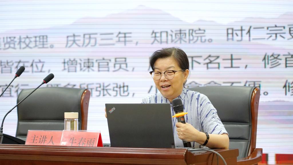 牛春雨从朋党之争、童年教育、被贬经历、家国情怀再到晚年致仕,欧阳修的一生大致可以从这五个方面来解读。会上,牛春雨通过品读讲解欧阳修不同人生阶段的文学作品,让学生们了解了欧阳修的传奇经历以及开阔的人生格局,真正理解体会到欧阳修高尚的品质和深厚的文化底蕴。讲座最后,牛春雨引用了一句欧阳修的诗文,“立身以立学为先,立学以读书为本”,来激励同学们享受读书,修养品行,共同进步。希望全体同学都能够从欧阳修的生平经历中汲取学术知识和前进的力量,在日常学习生活中努力成为更好的自己。