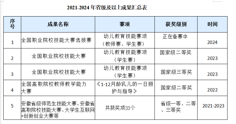 在学生培养方面,近三年来,指导学生获省级师范生技能大赛、省级职业技能大赛10项,指导学生互联网+创新创业大赛、挑战杯创业计划等获得33个奖项;教师参加省级教学能力大赛连续三年取得省级一等奖、二等奖、一等奖的好成绩,尤其是2022年取得突破性进展教师团队在全国职业院校技能大赛中获得二等奖的优异成绩,学前教育专业技能竞赛工作室团队教师指导学生参加2022年11月安徽省职业技能大赛学前组获得一等奖,2023年8月全国职业院校技能大赛(高职组)幼儿教育技能赛项(学生组)取得国赛三等奖、教师组取得国赛二等奖的好成绩,2023年11月指导学生参加安徽省师范生技能大赛获得三等奖。2024年1月教师指导学生参加安徽省高职院校幼儿教育技能赛项学生组和教师组均取得一等奖得好成绩,目前,正在积极准备国赛选拔赛。近3年学生一次性就业率平均96.25%,培养了滁州地区45%以上的园长和骨干教师,用人单位对毕业生总体满意度98.56%。为滁州及周边地区幼教事业输送了大批高质量人才。