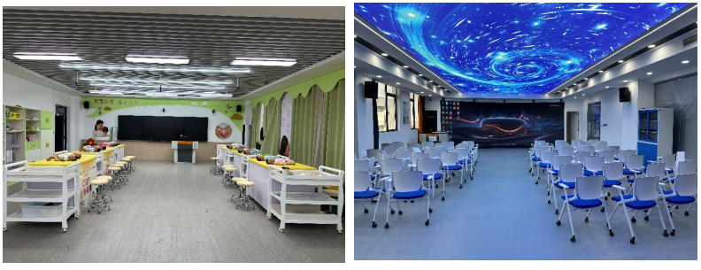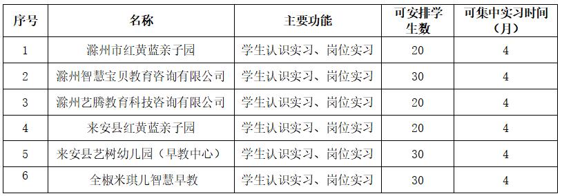 本专业构建“平台+模块+方向”的立体化课程体系,形成了“专业建设与企业发展同步、培养目标与企业需求同步、技能训练与岗位要求同步”的校企合作良好局面。充分发挥校内早期教育实训基地、婴幼儿照护实训室等构成的一体化现代教师教育示范实验实训中心的功能作用,目前,校外实训基地已达10余所,并与滁州市《全椒米琪儿智慧早教》、《滁州市红黄蓝亲子园》和《滁州智慧宝贝教育咨询有限公司》等多家早教机构和托育机构开展了深度融合,共同开展教科研课题和合作编写教材。新增校内实训基地2个,建成了现代教师教育示范实验实训中心,学前教育专业虚拟仿真实训中心已建设完成并投入使用,增强了学生岗位技能学习的沉浸式体验,全面提升学生能力和技能。