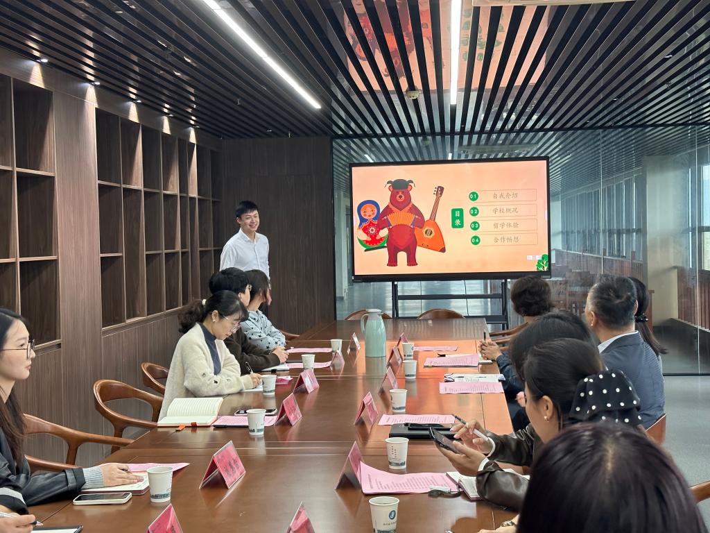 会上,王燕永书记详细介绍了学校办学特色、中俄合作办学的推进成果和即将赴俄交流教师的筹备情况,为双方进一步深化合作奠定基础。随后,叶子涵老师围绕俄罗斯伏尔加格勒国立师范大学的基本概况、优势学科展开介绍,分享了孔子学院在促进中俄文化交流中的桥梁作用,分享了自身在俄生活工作的实践经验。他还结合实际教学案例,阐述了该校教师的教学模式与课程设置特点,并转达俄罗斯学生对中国文化的兴趣点与交流需求,为双方合作提供了参考。