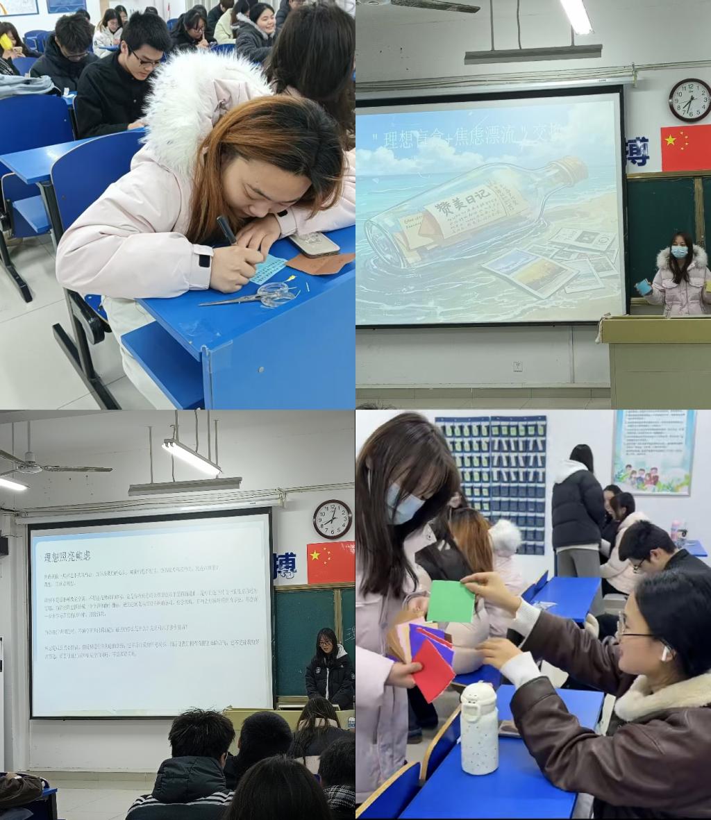 为引导学生树立积极心态、明确青春方向,12月24日,我院在尚知楼成功举办“理想盲盒+焦虑漂流”主题心理交流活动。该活动将理想书写与情绪释放相结合,以创意互动为载体,为同学们提供了表达自我、倾听他人的温馨平台,在寒冷冬日里传递出浓浓的同窗温情。