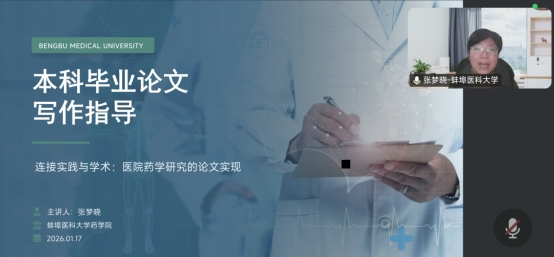 2026年1月17日上午,蚌埠医科大学药学院教科研办主任张梦晓通过线上平台,为滁州城市职业学院药学系教师及24级药学本科班学生作题为“连接实践与学术:医院药学研究的论文实现”的毕业论文写作指导讲座。讲座围绕毕业论文的意义、方法与规范展开,旨在提升学生的学术实践与综合研究能力。