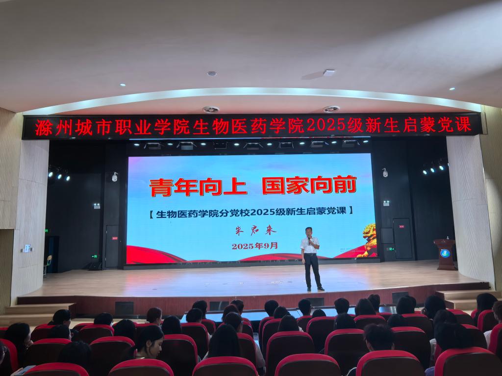 9月21日晚,生物医药学院在润德楼报告厅举行2025级新生入党启蒙教育党课。学院党总支书记朱启来以《青年向上 国家向前》为题,为近380名新生讲授了一场生动的党课,这也是新生大学生涯的“政治启蒙第一课”。