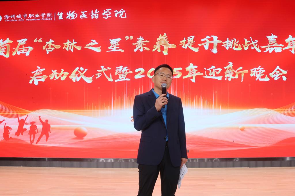晚会上,学院党总支书记朱启来致辞,代表学院向2025级新生表示诚挚欢迎与美好祝愿,并正式推介“杏林之星”素养提升挑战嘉年华。他指出,嘉年华是学院落实立德树人根本任务的重要载体,通过“三大模块、九大任务”的认证体系,将出勤内务、文明习惯、身心健康等综合素质要求,转化为具体可记录、可衡量的成长轨迹,为院风、学风建设注入全新活力。