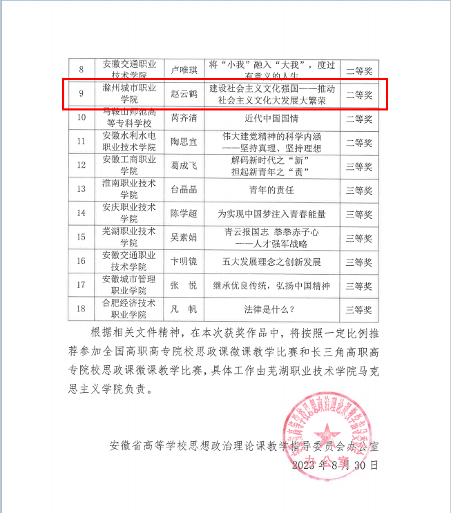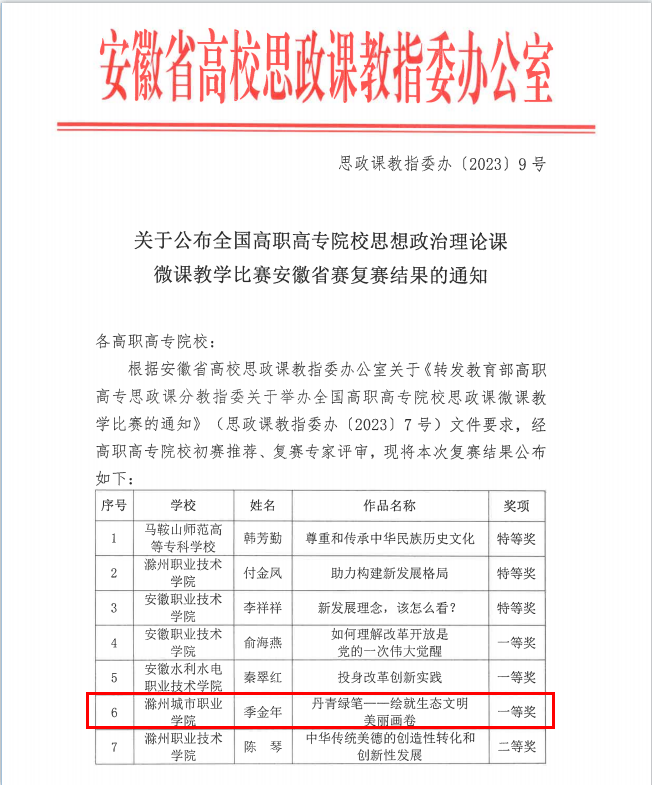 8月30日,安徽省高校思政课教指委办公室发布《关于公布全国高职高专院校思想政治理论课微课教学比赛安徽省赛复赛结果的通知》,经高职高专院校初赛推荐、复赛专家评审,我校马院季金年老师展示的微课“丹青绿笔——绘就生态文明美丽画卷”荣获一等奖、赵云鹤展示的微课“建设社会主义文化强国——推动社会主义文化大发展大繁荣”荣获二等奖,并被选拔参加长三角高职高专思想政治理论课微课教学比赛。
