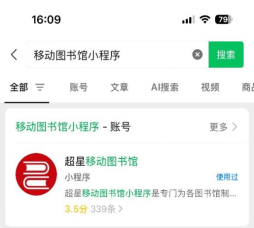 在“微信”搜索框里输入“移动图书馆小程序”。首次登录需要打开“手机定位”,同时在学校范围内登录