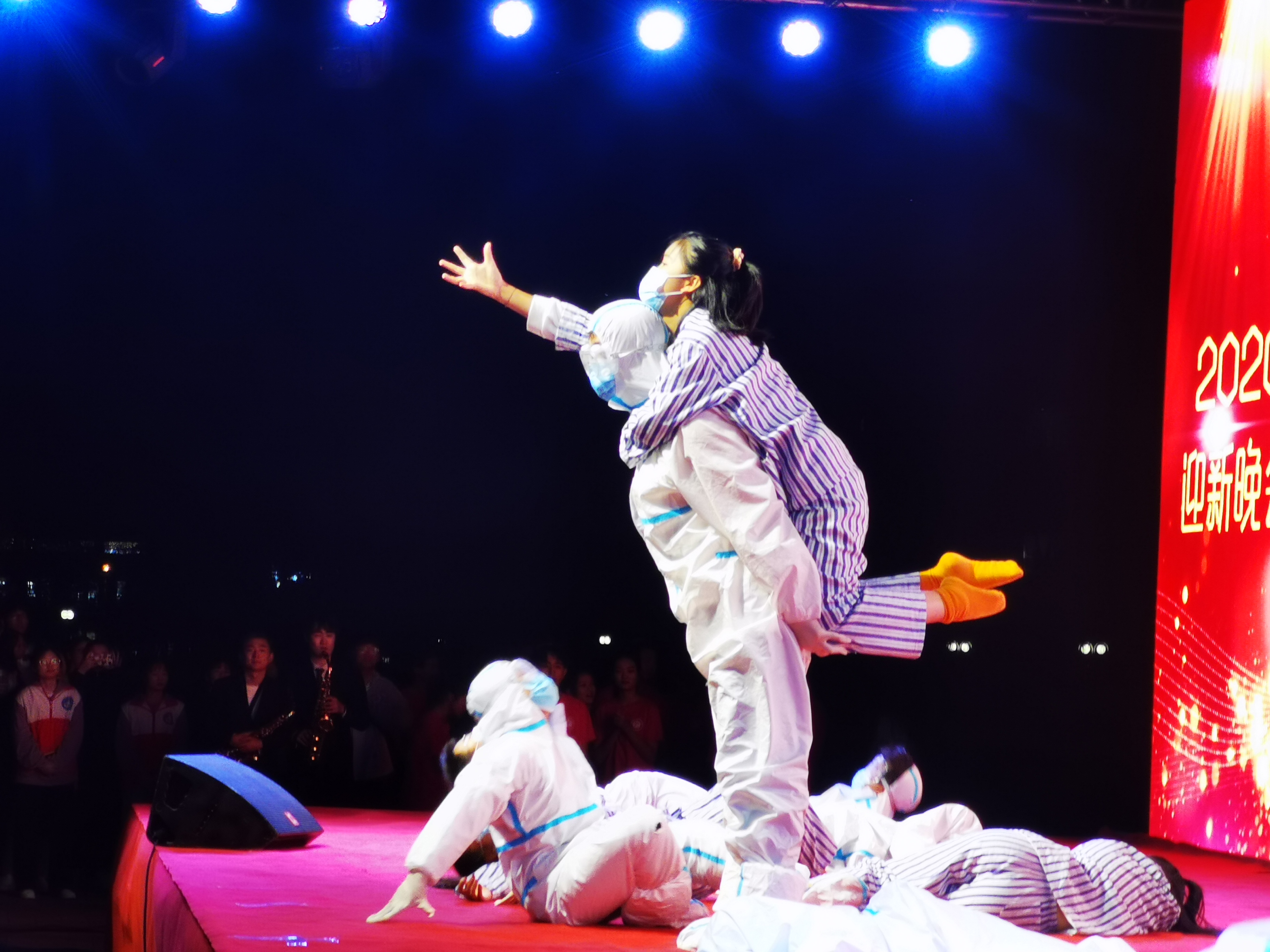 本次迎新晚会以“青春告白祖国,芳华共创未来”为主题,囊括了民族舞、乐器演奏、竞技表演、歌曲演唱、街舞、诗朗诵等15个形式多元、内容丰富的节目,为广大新生呈现了一场精彩绝伦的视听盛宴,同时也充分展现了我院学子的青春风采以及奋发向上的精神风貌。欢快优美的开场舞《中国鼓》,正式拉开了本场晚会的帷幕;一曲《中国梦》,唱响了催人奋进的时代旋律;萨克斯演奏《站在草原望北京》,传达了草原儿女热爱家乡、心系祖国的爱国情怀;融合音乐和舞蹈元素的洗手操表演,展现了医护职业的艺术之美;教官竞技表演《咱当兵的人》,铁血硬汉们的精彩表演,让人看了血脉喷张;歌伴舞节目《追光者》,彰显了城院学子追逐梦想的青春脚步永不停歇;曹士东副院长带来的个人独唱《高飞的海燕》,唱出了不惧风雨、勇敢前行的信念和豪情;曼妙轻灵的舞蹈《水之灵》,将水的灵动和柔美展现的淋漓尽致......最后,晚会在歌曲《我们都是追梦人》的嘹亮歌声中圆满落下帷幕。