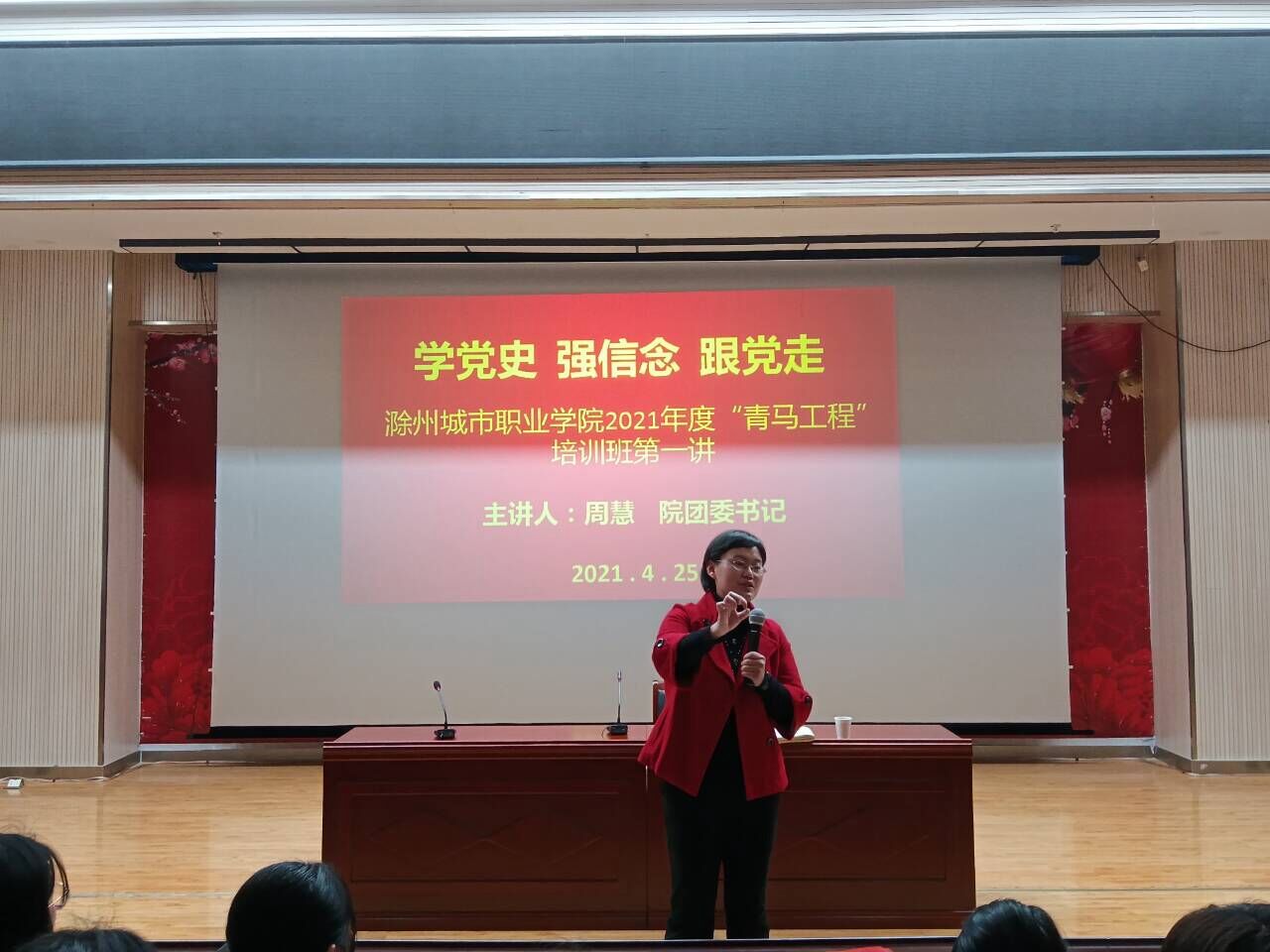 开班仪式结束后,周慧作“学党史、强信念、跟党走”专题培训。周慧在讲课中用中国共产党一次次的果断行动、科学决策让学员充分感受到中国共产党的英明领导,同时还结合自己的基层挂职经历,勉励学员们牢记初心使命,坚定理想信念,永远听党话、跟党走。