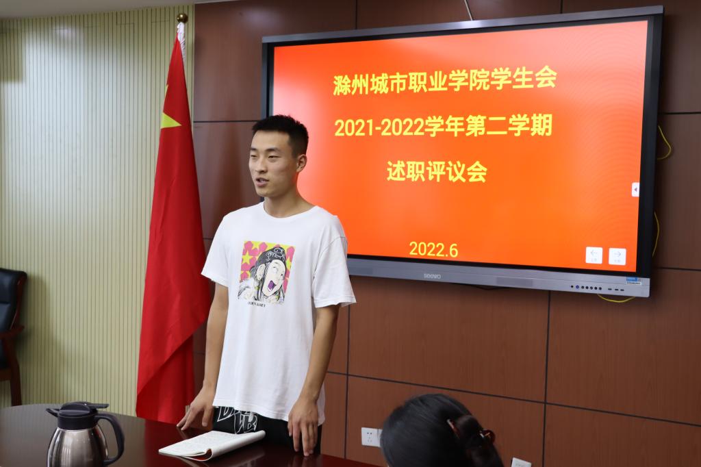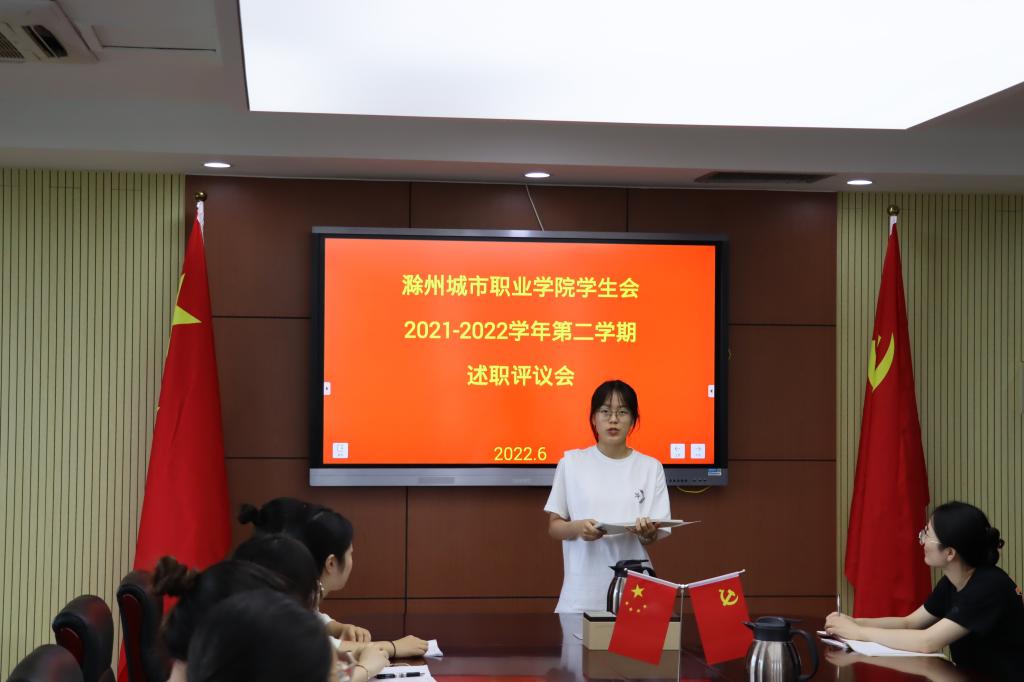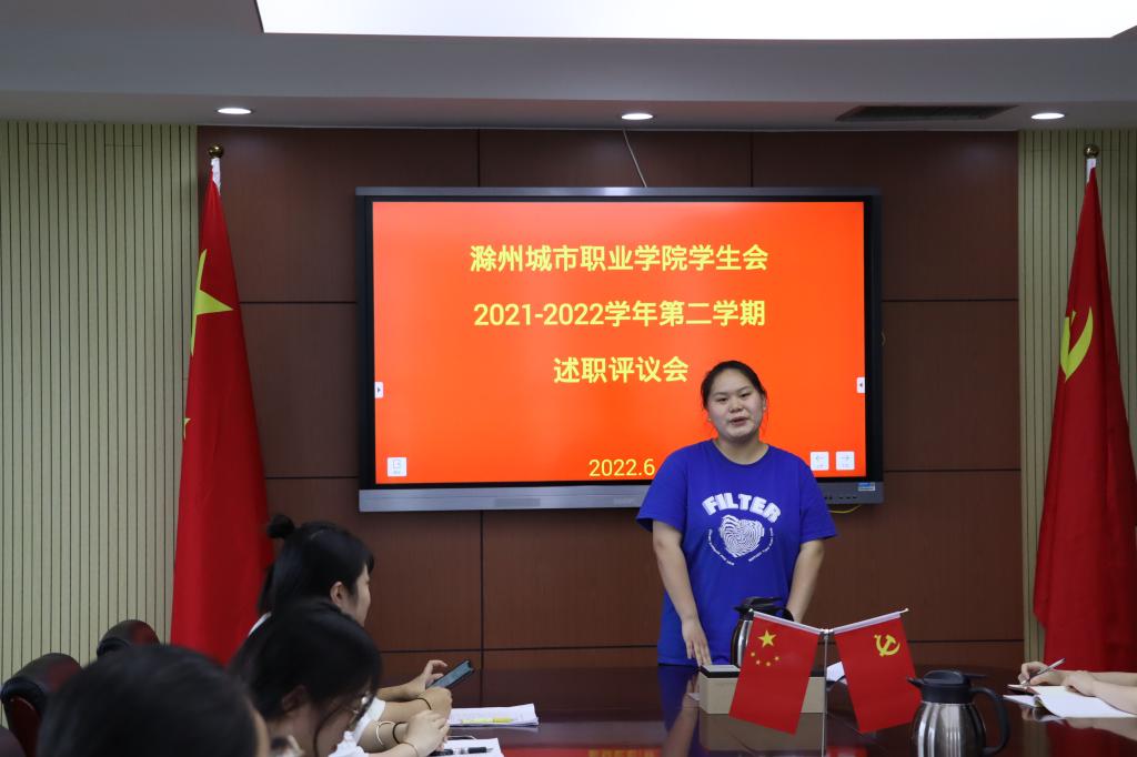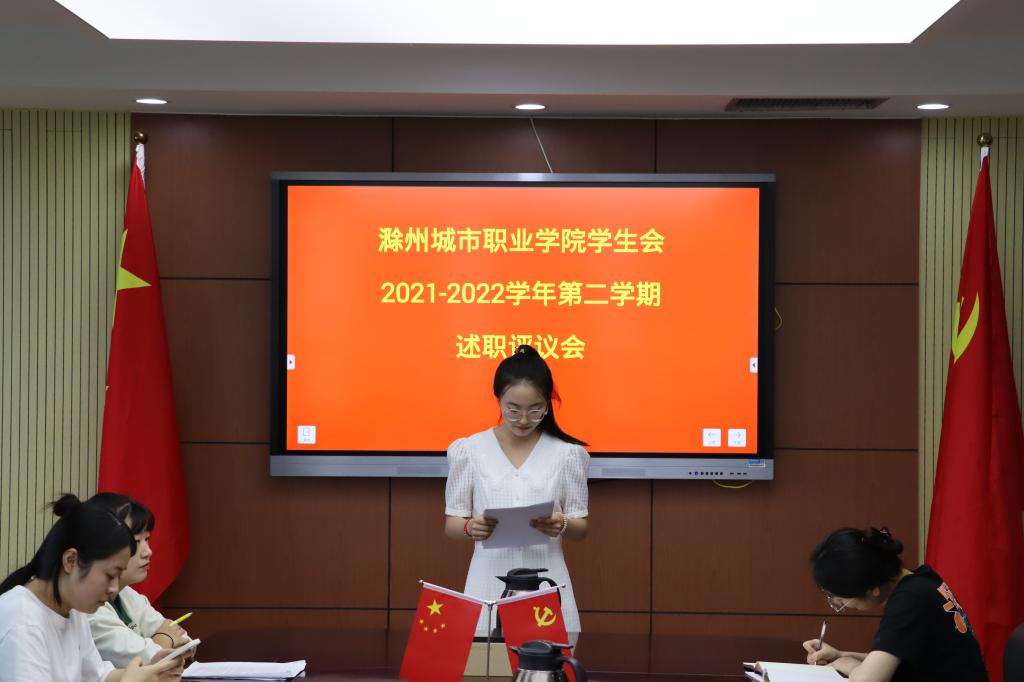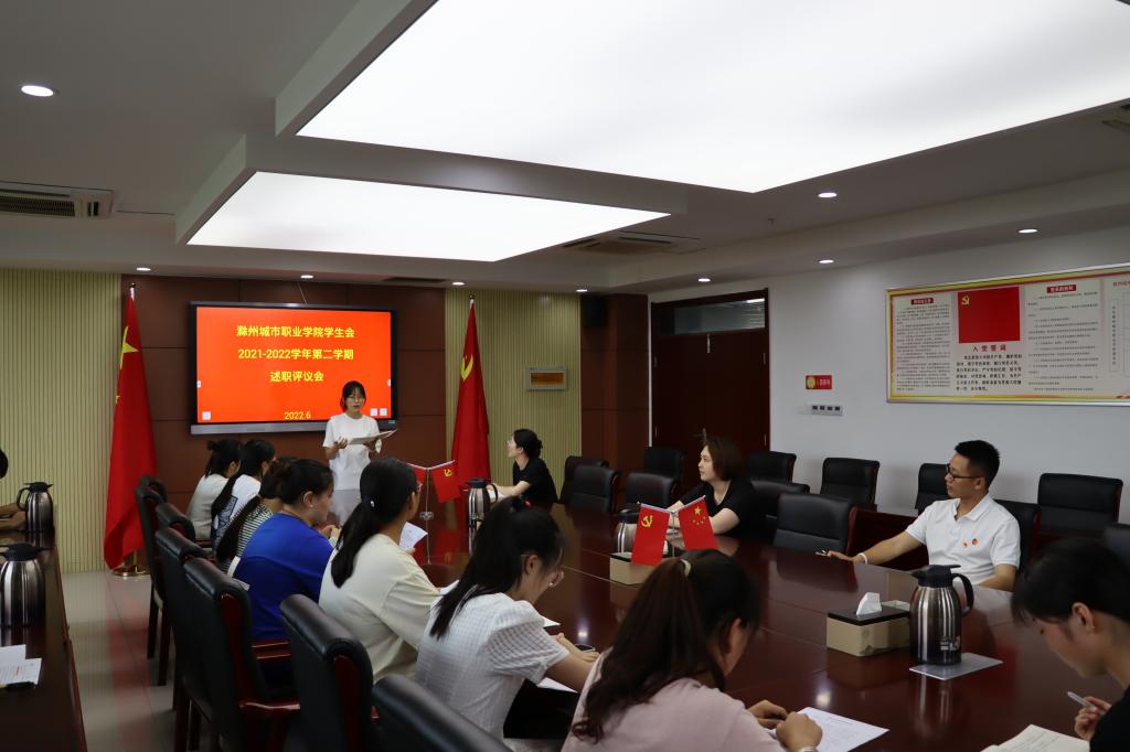 6月7日下午,滁州城市职业学院2021-2022学年第二学期校学生会述职评议大会在图文中心第四会议室举行。述职人员为我校学生会主席团成员及各工作部门主要负责人。校团委副书记陈婷婷、校团委主席团对接人员、校学生会工作人员代表、普通学生代表共计40余人参加了会议。会议由校学生会执行主席张文鑫主持。