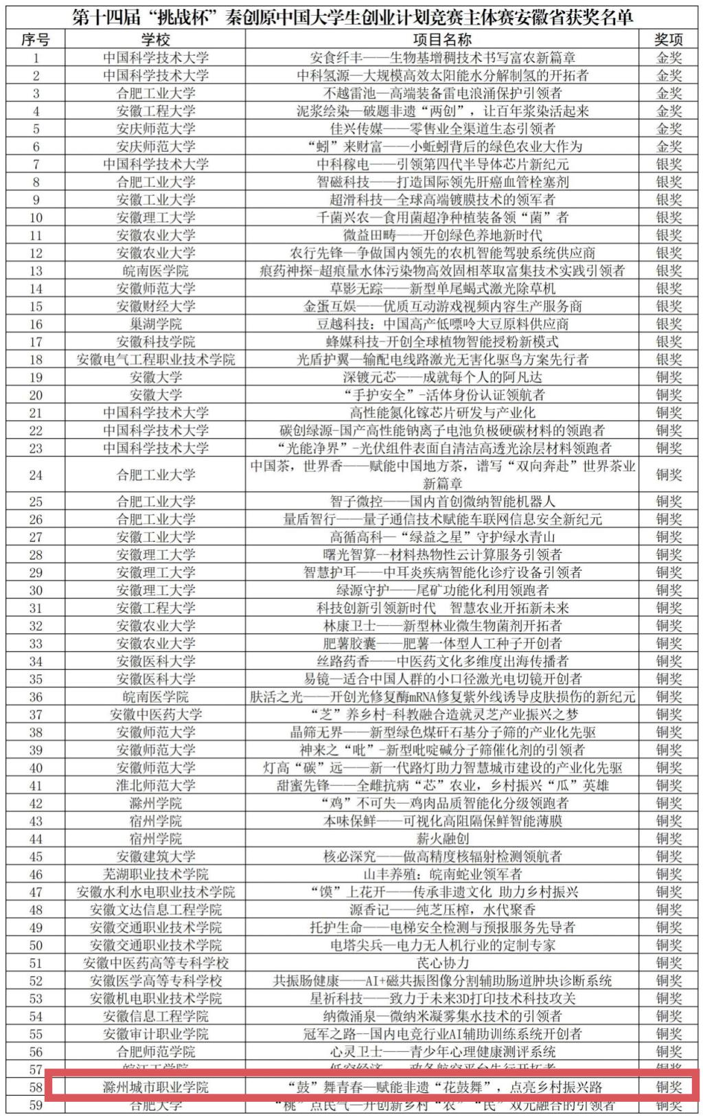 近年来,滁州城市职业学院不断推动创新创业教育发展,持续深化创新创业教育改革。一年来,滁州城市职业学院积极组织、精心筹备,经过多轮校内评审、专家指导,遴选出11个项目参加省赛,获得金奖2项,银奖3项,铜奖6项,最终1支队伍入围国赛评审,并获得国赛铜奖。