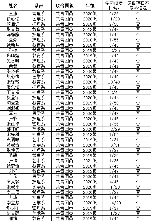 8. 工作人员中除一年级新生外的本专科生最近1个学期/最近1学年/入学以来三者取其一,学习成绩综合排名在本专业前30%以内,且无课业不及格情况;研究生无课业不及格情况。 |