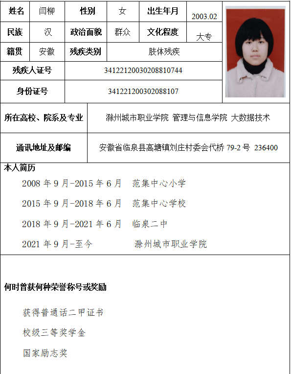 同意推荐滁州城市职业学院管理与信息学院大数据技术专业闫柳同学申报 2022 年度“交通银行残疾大学生励志奖”;
