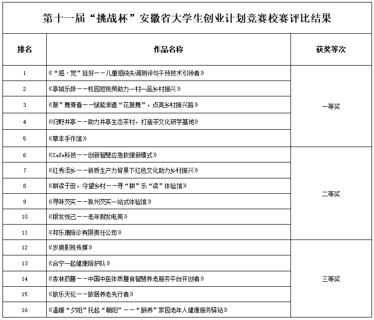 为更好选拔作品参加第十一届“挑战杯”安徽省大学生创业计划竞赛,学校于4月20日下午在图文中心四楼报告厅举办第十一届“挑战杯”安徽省大学生创业计划竞赛校赛决赛,各学院积极申报优秀作品,经过学院预选赛到校级评审,最终有16件作品入围决赛。根据专家现场评审,校赛评比结果如下。根据团省委《关于举办第十一届“挑战杯·华安证券”安徽省大学生创业计划竞赛的工作提示》文件要求,学院拟根据排名推荐前11件作品参加省赛。现予以公示。