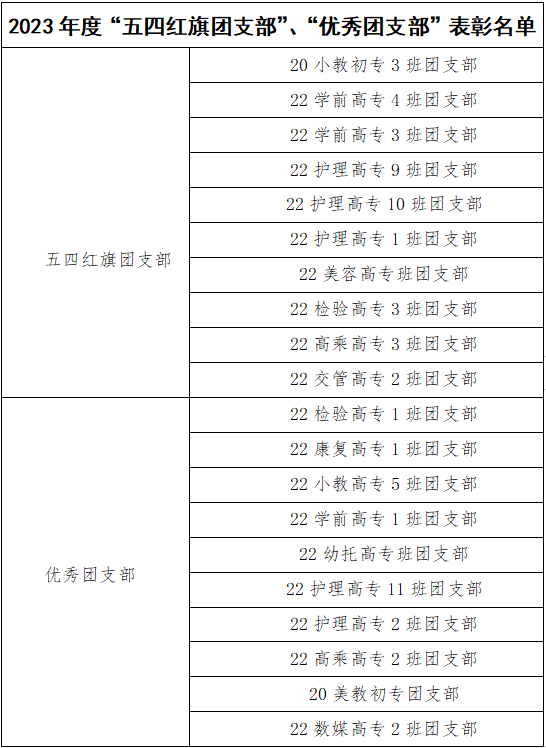 为深入学习贯彻习近平新时代中国特色社会主义思想,提升高校共青团组织力、引领力、服务力和大局贡献度,集中展现我校团支部建设成果和典型经验。校团委决定:拟评选20小教初专3班等10个团支部为2023年度“五四红旗团支部”,拟评选22检验高专1班等10个团支部为2023年度“优秀团支部”。现将拟评选结果公示如下: