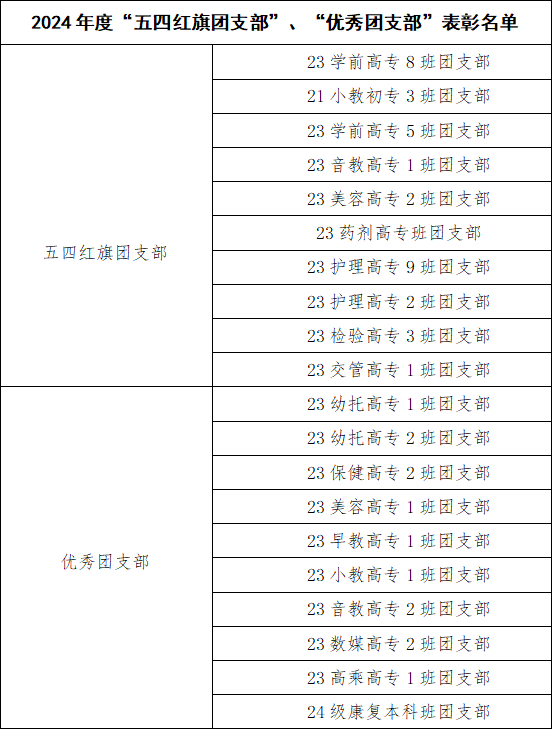 为深入学习贯彻习近平新时代中国特色社会主义思想,提升高校共青团组织力、引领力、服务力和大局贡献度,集中展现我校团支部建设成果和典型经验。校团委决定:拟评选23学前高专8班团支部等10个团支部为2024年度“五四红旗团支部”,23幼托高专1班团支部等10个团支部为2024年度“优秀团支部”。现将拟评选结果公示如下: