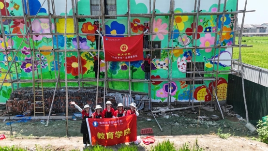 在2025年暑期“三下乡”社会实践活动中,“绘美乡村”团队再次出发,奔赴天长、来安、明光等地开展为期13天的墙绘创作。队员们冒着酷暑高温,每天工作十余小时,在脚手架上精心勾勒,在墙壁前专注绘制。汗水浸透了衣裳,阳光晒红了脸庞,但没有人退缩。他们用专业和热情克服困难,高质量完成所有创作任务,将艺术真正“种”在乡村大地上。这次实践不仅提升了学生的专业技能和团队协作能力,更让他们在服务中了解国情、认识乡村,增强了社会责任感和时代使命感,实现“受教育、长才干、作贡献”的有机统一。