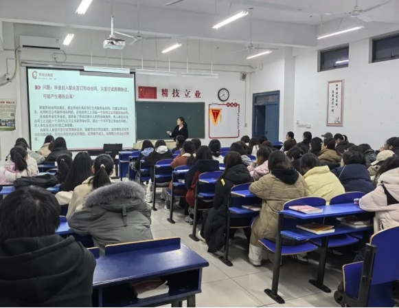 同时,青年法学社还成功举办了一场劳动法讲座。讲座由青年法学社的指导老师高立萍主讲。高立萍围绕《中华人民共和国劳动法》及《中华人民共和国劳动合同法》等相关法律法规,从劳动合同的签订、履行与解除,劳动者权益保护,以及职场中常见的劳动法律问题等多个方面进行了深入浅出的讲解。此次讲座不仅增强了同学们的劳动法治意识。也为他们未来的职业生涯提供了有力的法律保障。