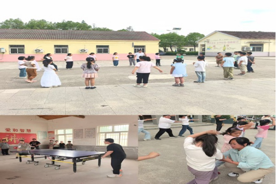 党员教师活动现场,教育工作者们充分发挥专业特长,有序开展特色教学实践。乒乓球教学区,邹海潮老师担任专项教练,从握拍姿势、站位要领等基础环节展开系统指导,通过分解动作示范与专业术语解析,引导学员开启乒乓运动启蒙之旅。教学成果展示环节组织的小型对抗赛,学员全神贯注投入攻防训练,在规范动作的实战应用中深化对竞技规则的理解。干磨昊老师设计的复合型体能课程兼具趣味与教育性,"听数抱团"指令反应类游戏与"阻击战"战术协作项目交替开展,学员在结构化游戏中同步提升运动素质与团队协作能力。传统武术传承区域,温小娇老师完整演示武术套路体系,将抱拳礼的文化内涵与马步冲拳的技术规范相结合,系统阐释武德修养与运动技能的共生关系。学员们专注聆听理论讲解,严格规范技术动作,通过模块化训练展现少年武者风范,在提升身体素质过程中深化对传统武术文化的认知。